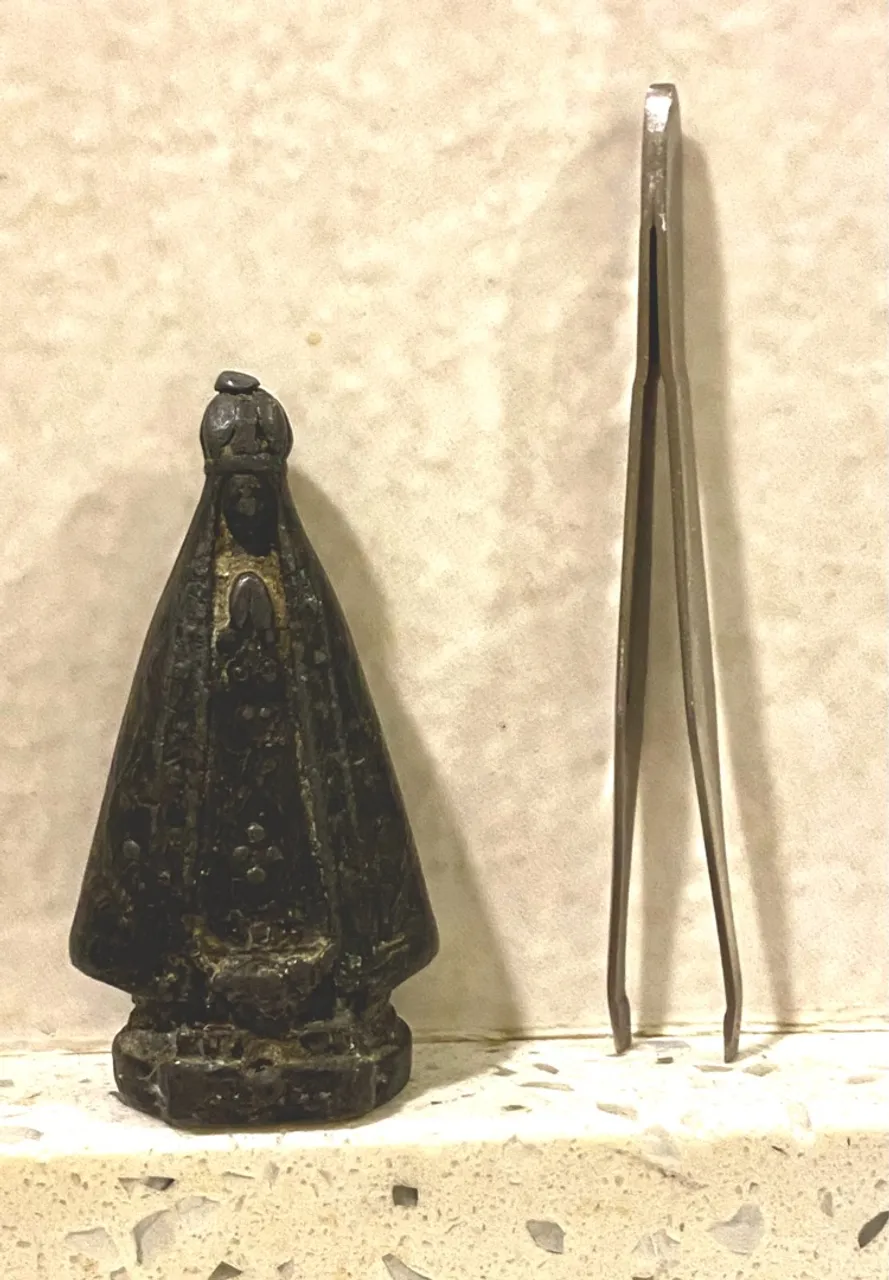 De Bolso! Nossa Senhora Miniatura, 5cm, trabalhada em chumbo c/ frente e manto texturizados. Muito antigo! Desapego com valor? Floripa, SC.
