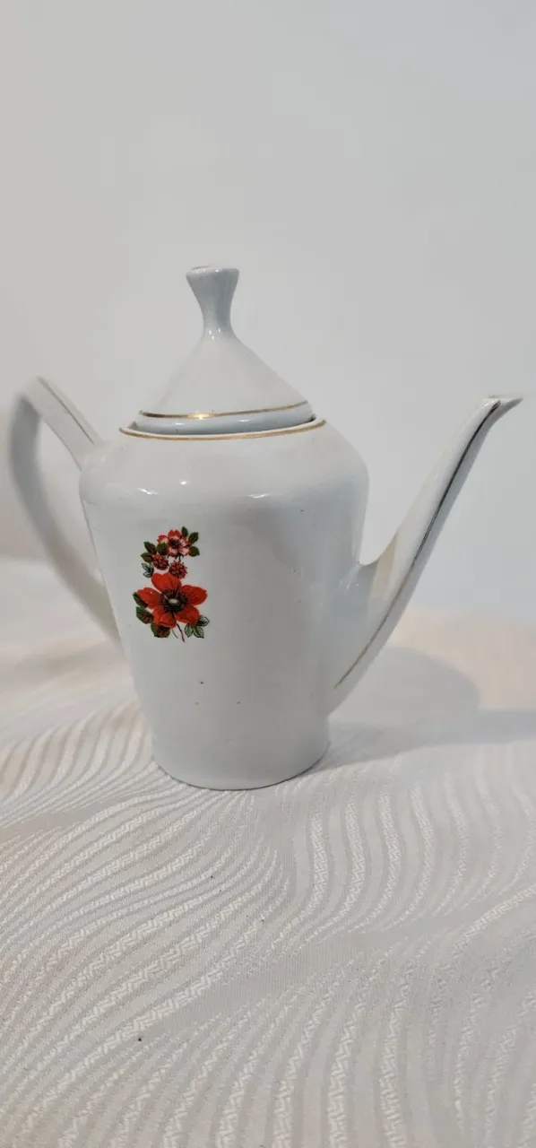Bule de porcelana branco com detalhes em dourado e flores vermelhas. Anos 80