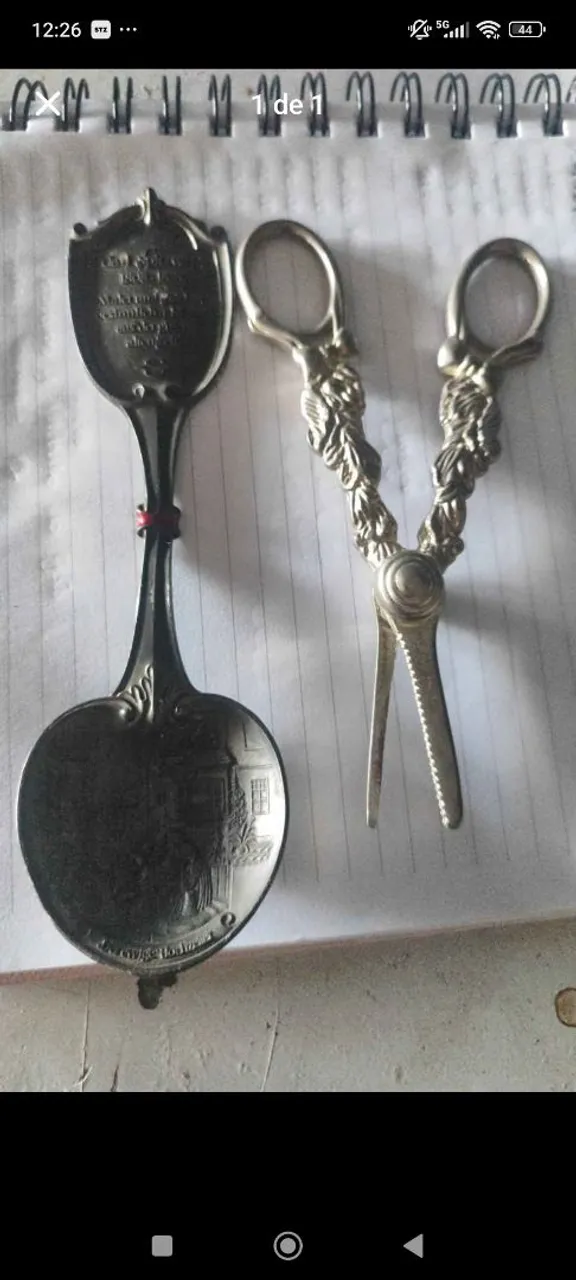 Conjunto de peças antigas, ideal para colecionadores e apreciadores de história. Uma colher com detalhes únicos e um par de tesouras decorativas, ambos com design vintage. Adicione um toque de elegância e história à sua coleção!
