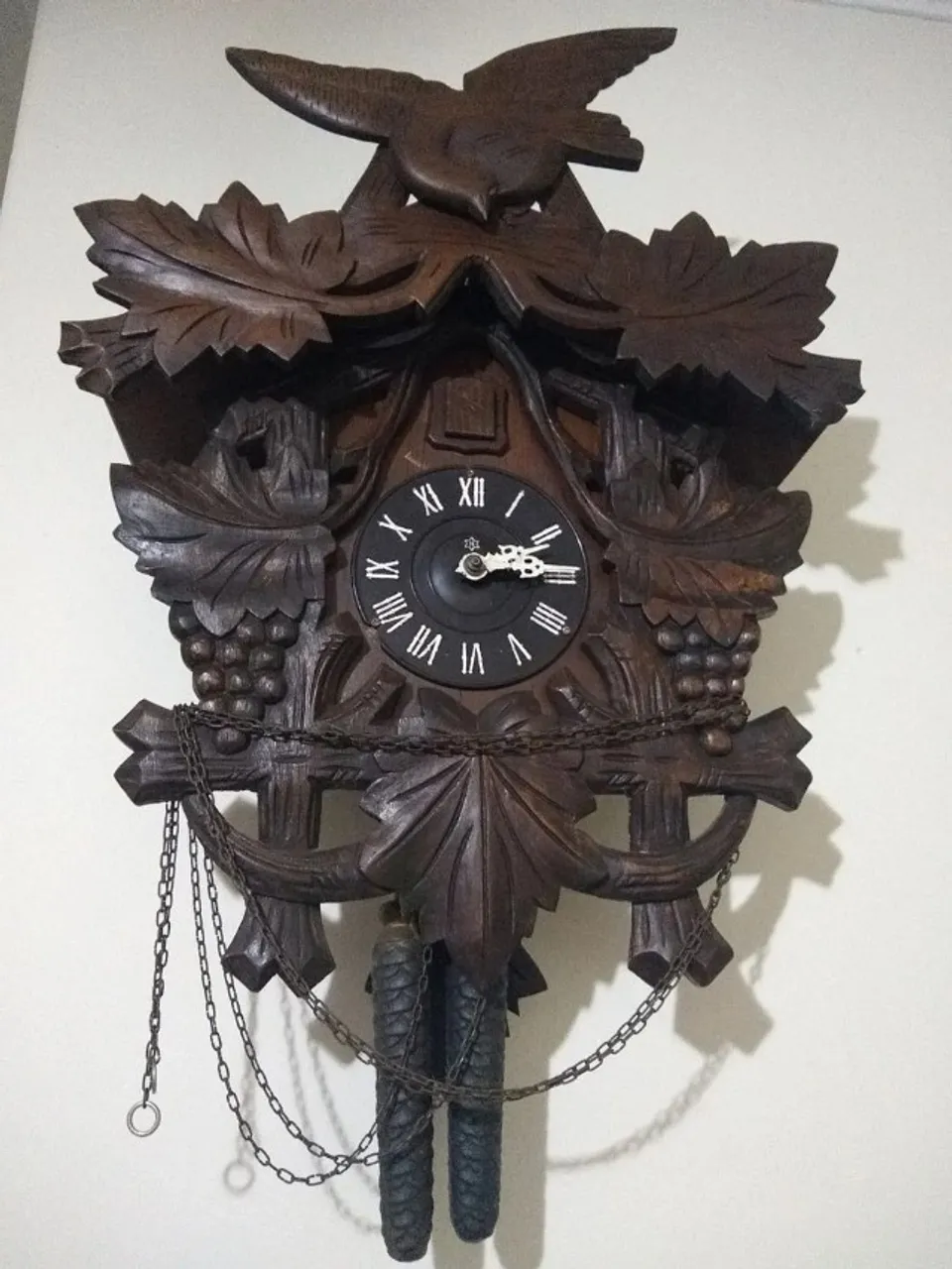 Lindo relógio cuco em madeira entalhada, perfeito para adicionar um toque rústico e charmoso à sua casa. Design clássico e elegante, ideal para colecionadores e amantes de peças únicas.