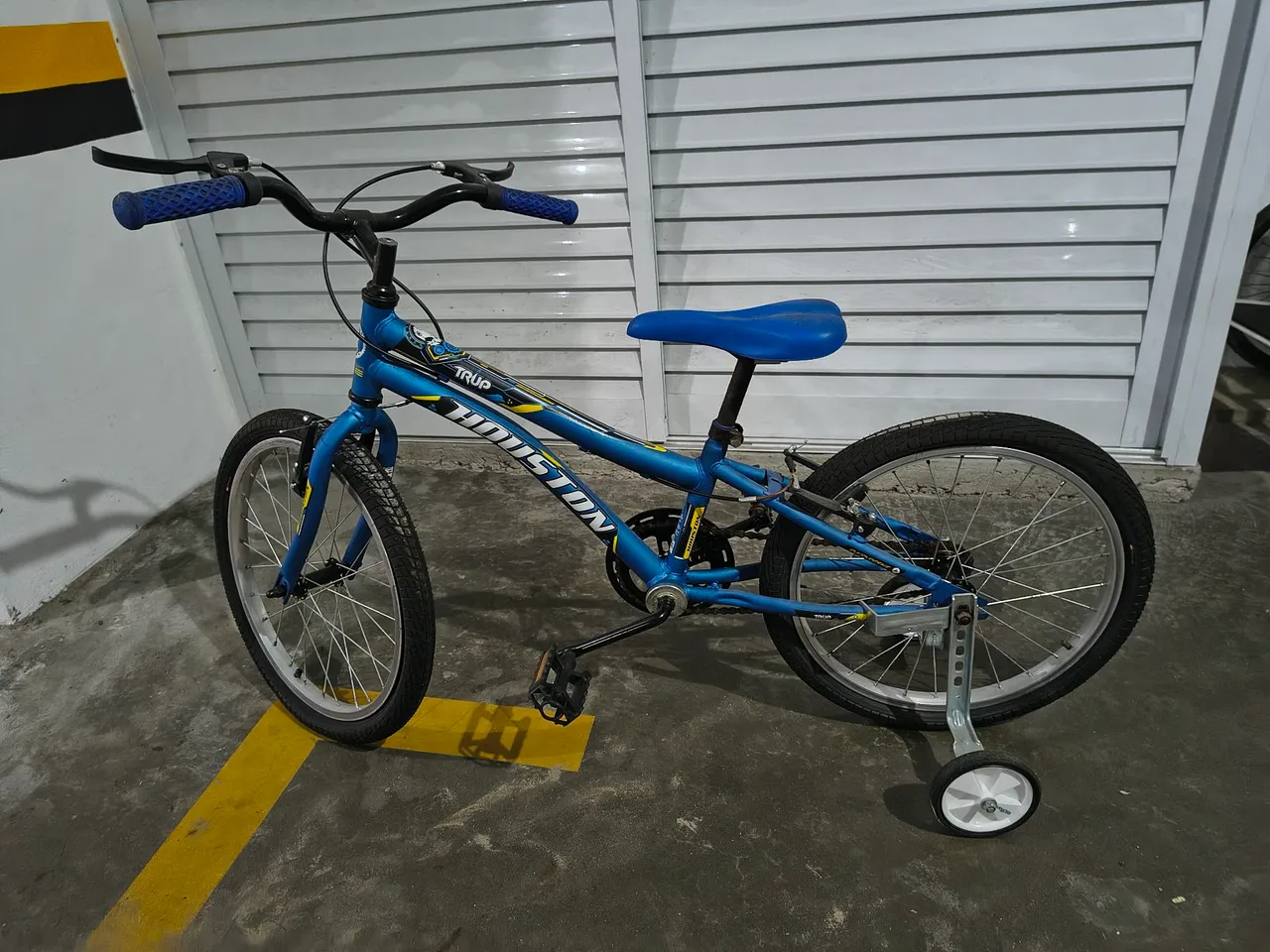 Houston para criança de 4 a 8 anos. Tem rodinhas laterais que podem ser retiradas quando a criança se sentir segura. Pouquíssimo uso.