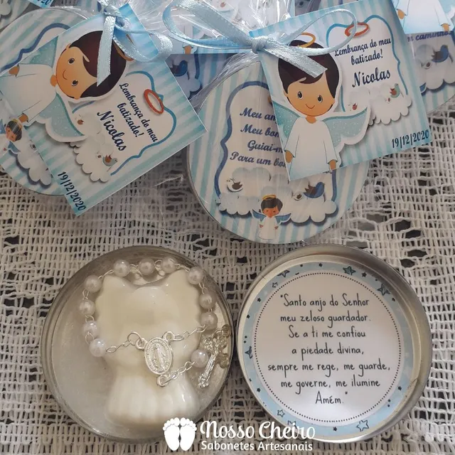 Latinha com anjinho de sabonete e mini terço. Vai embalada no saquinho plástico transparente e com tag personalizada.