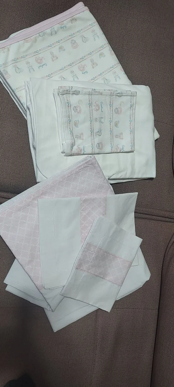 Vendo 2 jogos de lençol para berço um de malha 3 peças nunca usado, lençol de baixo, lençol de cima e fronha. O outro de percal de algodão com 4 peças lençol de baixo, de cima e 2 fronhas. Mais uma manta de malha dupla com 2 panos de boca.