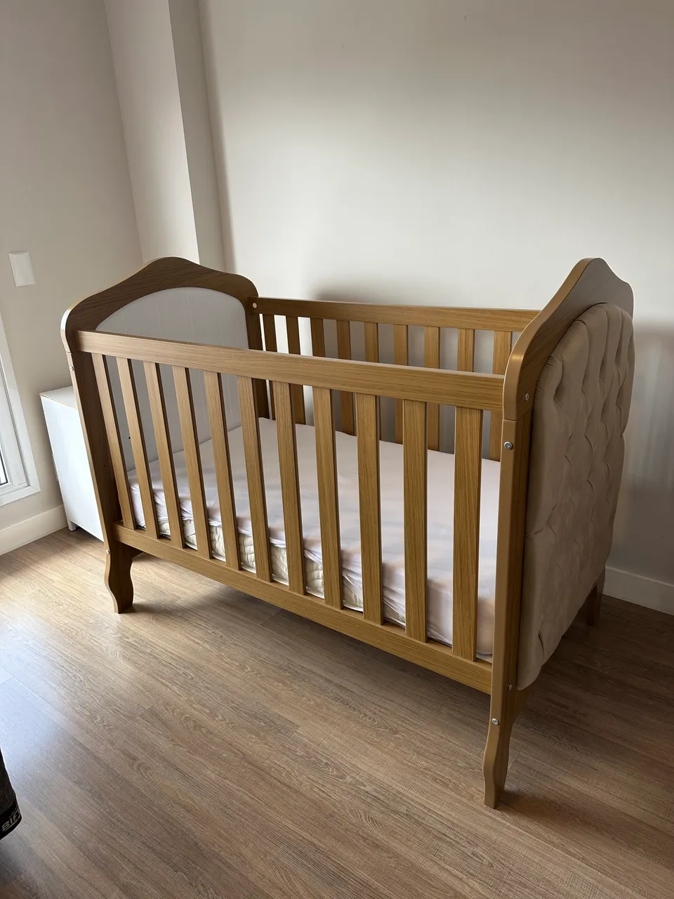 Lindo berço mini cama em MDF com detalhes em capitonê. Design elegante e moderno para o quarto do seu bebê. Conforto e segurança garantidos. Vai com colchão novinho. E depois da de transformar em casa.