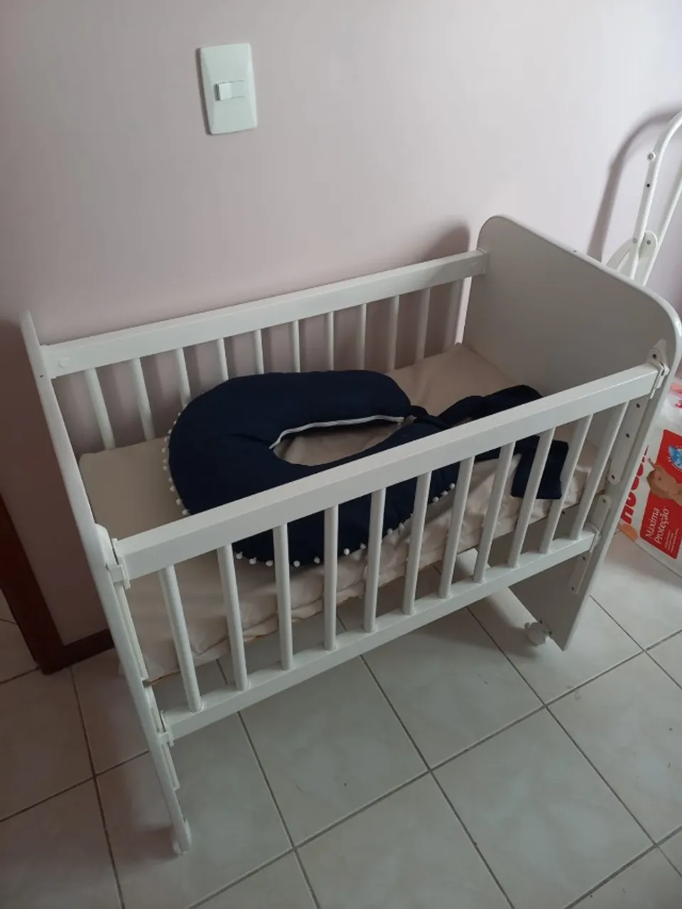 Lindo mini berço com grade regulável, usado por apenas 3 meses, está em ótimo estado e pronto para uso. ACOMPANHA de BRINDE almofada de amamamentação azul marinho.