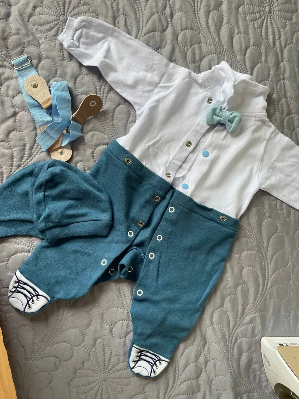 Conjunto de saída de maternidade perfeito para o seu bebê! Confeccionado com tecido macio e confortável, este conjunto é ideal para receber o seu pequeno com muito estilo e carinho. Inclui macacão, gorro e gravata borboleta, um charme!