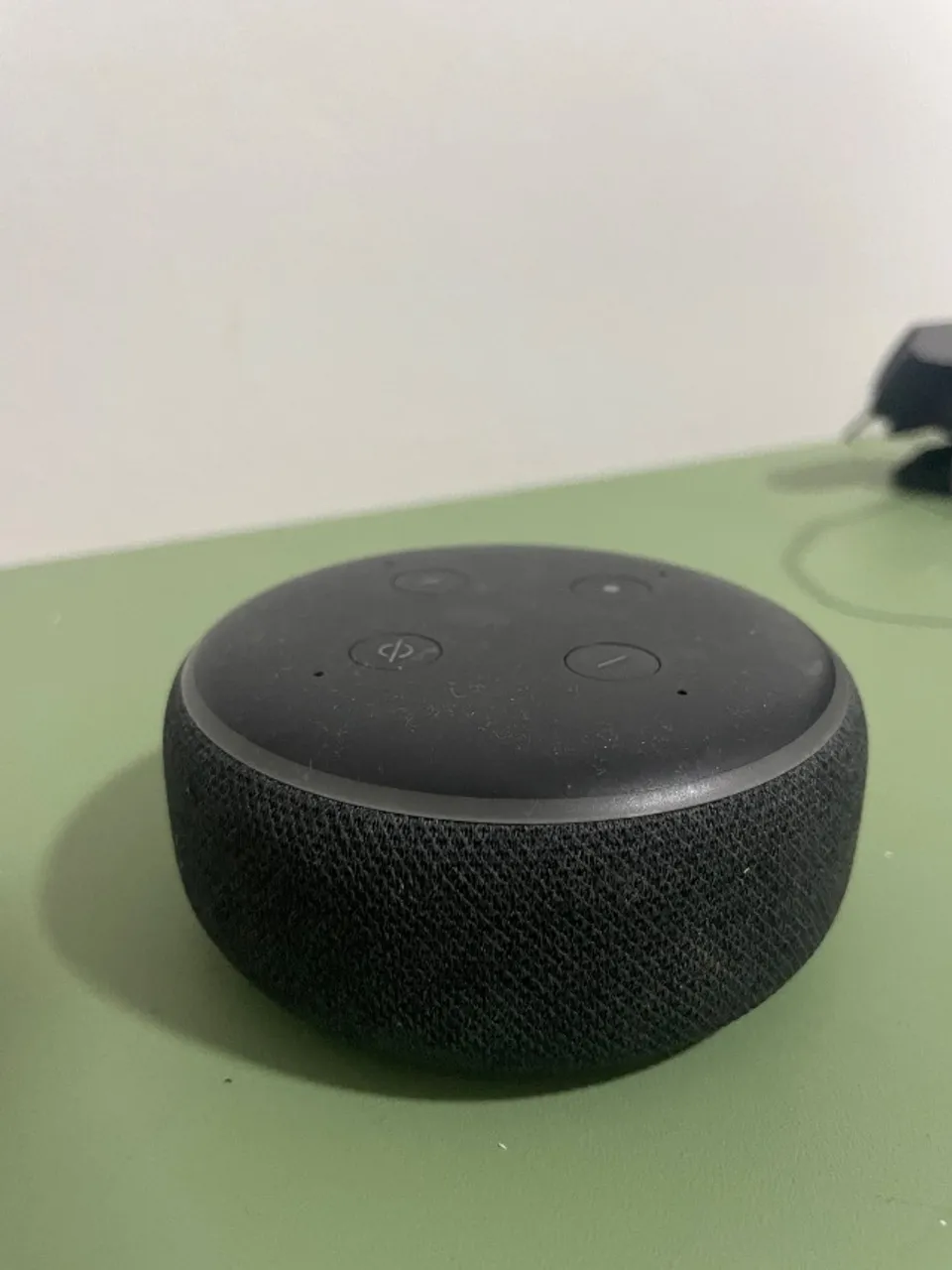 O Amazon Echo Dot 3ª Geração é um smart speaker compacto com Alexa, medindo \(43\text{\ mm}\times 99\text{\ mm}\times 99\text{\ mm}\) e pesando cerca de \(300\text{\ g}\). Possui alto-falante de \(1,6^{\prime \prime }\) para som de alta qualidade, quatro microfones para detecção de voz a longa distância, Wi-Fi de banda dupla (\(2.4\text{\ GHz}/5\text{\ GHz}\)), Bluetooth e saída de áudio de \(3,5\text{\ mm}\). Especificações Técnicas Detalhadas: Conectividade: Wi-Fi banda dupla compatível com redes 802.11 a/b/g/n/ac (\(2.4\) e \(5\text{\ GHz}\)).Bluetooth: Suporte ao Perfil de Distribuição de Áudio Avançada (A2DP).Áudio: Alto-falante de \(1,6\) polegadas. Saída de áudio de \(3,5\text{\ mm}\) para uso com alto-falantes externos.Microfones: Tecnologia de longo alcance, facilitando a captura de voz em ambientes com ruído.Botões: Volume (+/-), Ação (botão de ponto), e botão para silenciar o microfone.Requisitos do Sistema: Pronto para se conectar ao Wi-Fi. O aplicativo Alexa é compatível com dispositivos Fire OS, Android e iOS, além de acessível pelo navegador.Energia: Fonte de alimentação de \(15\text{\ W}\) inclusa na caixa.Dimensões e Peso: \(43\text{\ mm}\times 99\text{\ mm}\times 99\text{\ mm}\) e \(300\text{\ gramas}\). O dispositivo é compatível com casas inteligentes, permitindo controlar luzes, interruptores e termostatos por comando de voz.