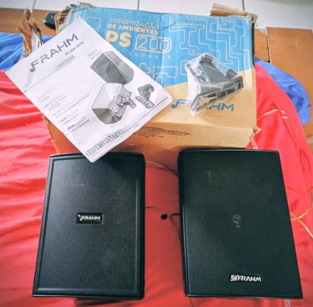 Potencialize a sonorização do seu ambiente com as caixas de som Frahm PS200! Som de alta qualidade e design elegante para uma experiência sonora imersiva. I com caixa manual suporte ZAP abaixo chama