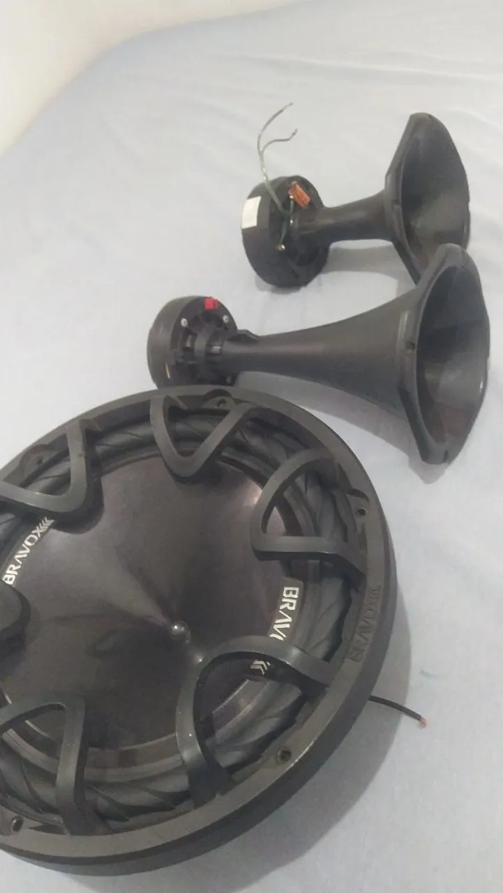 Subwoofer e corneta Bravox de alta qualidade. Perfeito para seu projeto de som automotivo. Som potente e limpo.