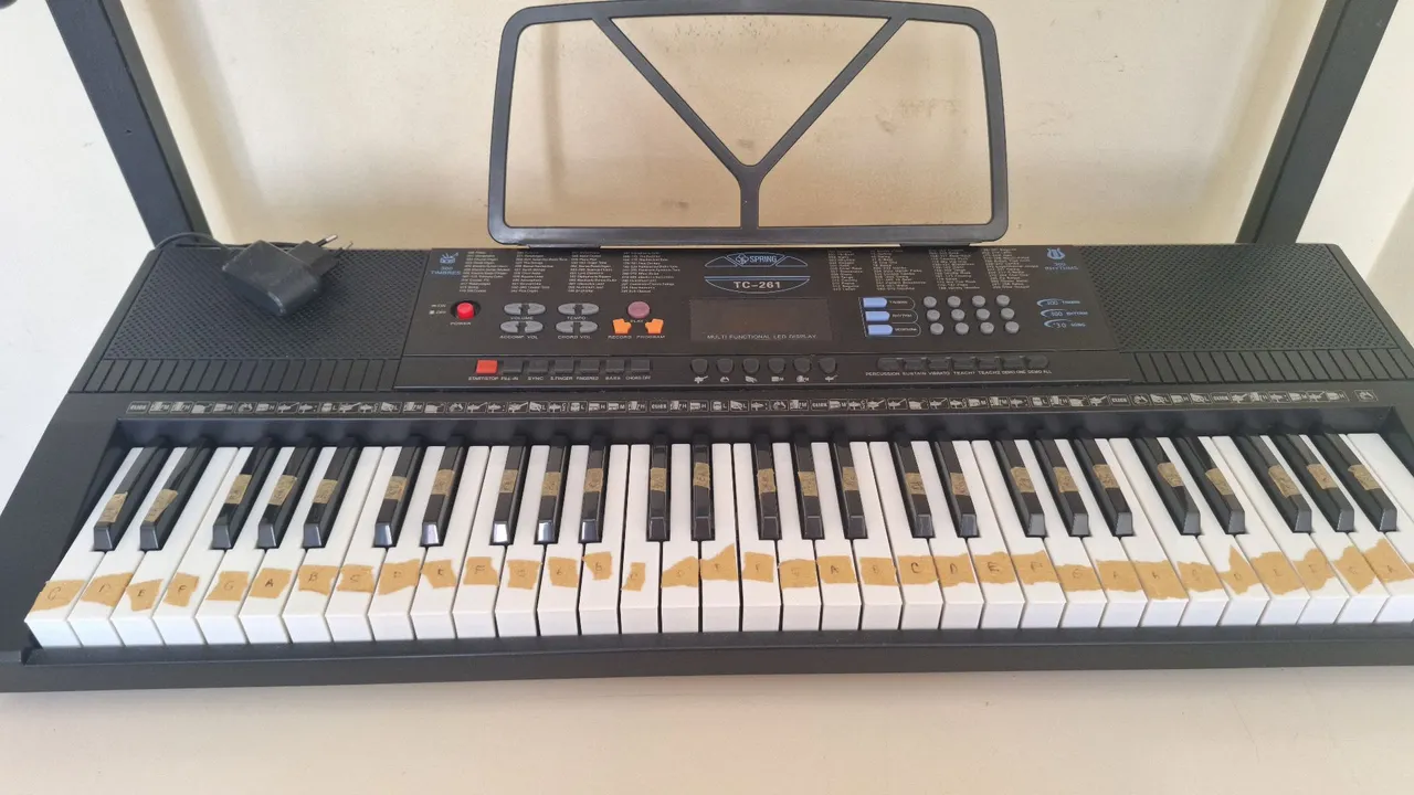 Teclado musical Estudante Spring TC-261 com diversas funções e display LED. Ideal para iniciantes, acompanha suporte para partituras, perfeito para aprender e se divertir!