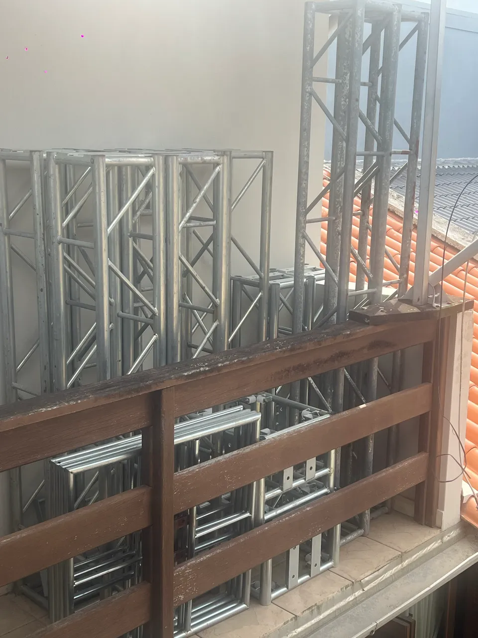 Vendo treliças com 2 sleeves, 4 sapatas, 2 paus de carga, 2 talhas 3m, formam um trave de 2,50x6,00 mais dois pirulitos de 2m. São 6 peças de 150, 2 de 200, 2 de 100. Q25, aço galvanizado.