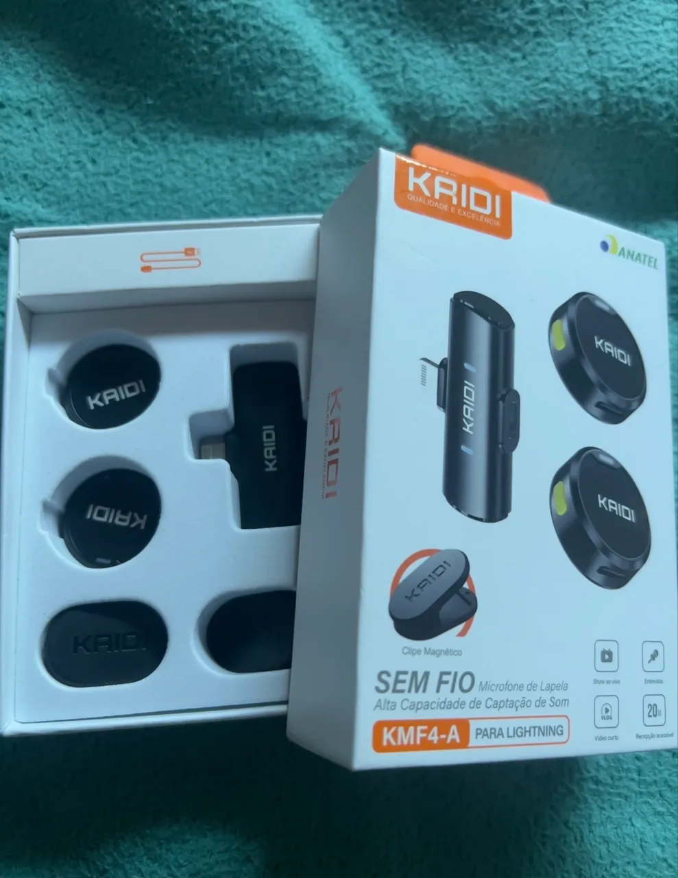 Microfone de lapela sem fio KMF4-A da Kaidi, ideal para vídeos com alta capacidade de captação de som. Perfeito para entrevistas, lives e vídeos curtos, garantindo áudio de qualidade.
