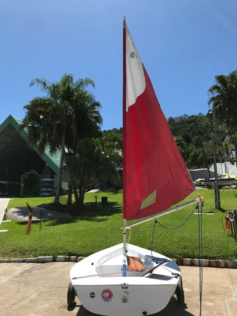 Barco monotipo DINGUE, usado e pronto para velejar. Acompanha -Veleiro monotipo Dingue -carrinho de encalhe, -mastro, -retranca, -vela, -leme, -bolina -capa de proteção, -cabos e acessórios.