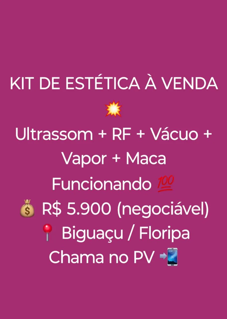 Transforme sua rotina de beleza com este kit completo de estética! Inclui ultrassom, RF, vácuo, vapor e maca, tudo funcionando perfeitamente. Ideal para quem busca resultados incríveis e profissionais.