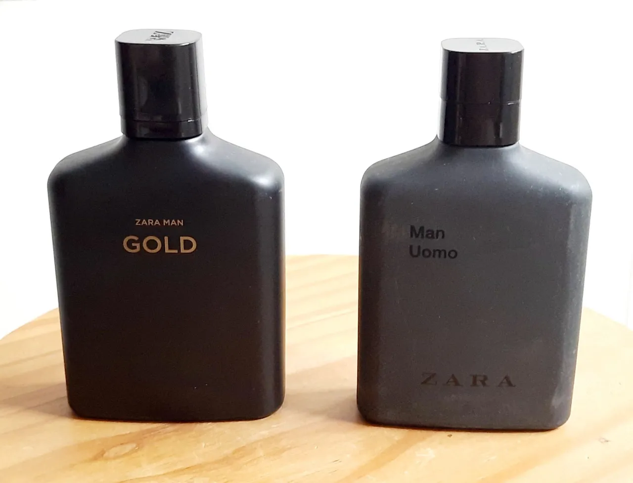 Perfumes Zara Uomo e Gold(100ml) Uomo volumetria na altura da palavra Uomo e Gold um pouco acima da palavra Zara Man