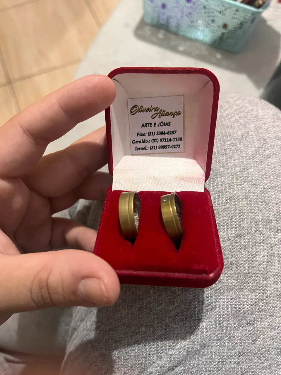 Aliança que eram dos meus pais, dentro delas está escrito uma frase e a inicial do casal que seria C + F. Não sei o tamanho do anel, ele foi feito em Minas Gerais.