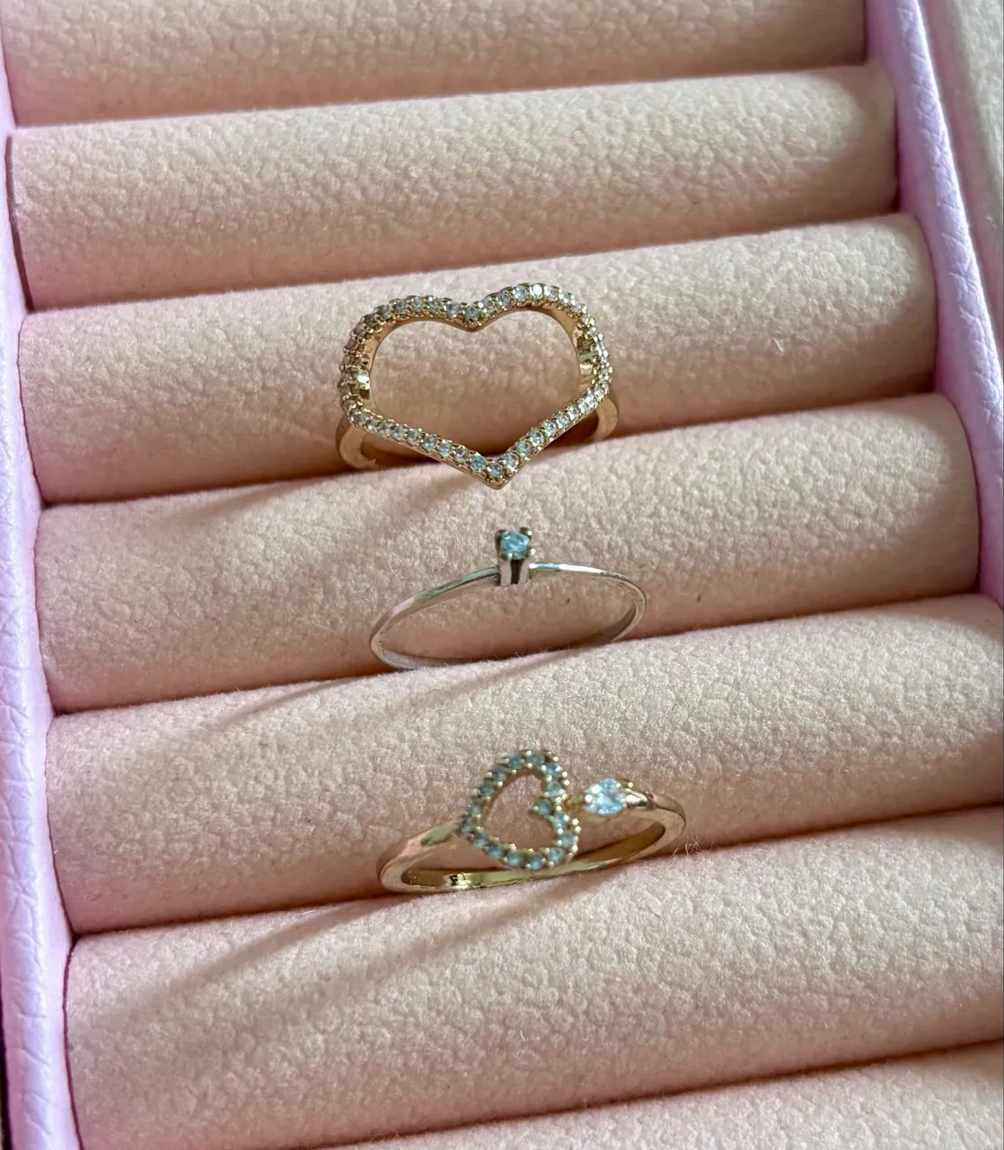 - Anéis de coração folheados e com pedrinhas de zircônia