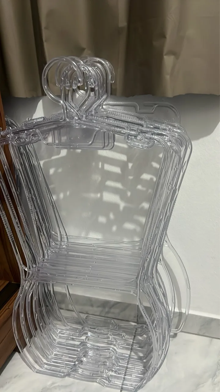 Conjunto de cabides transparentes, perfeitos para organizar suas roupas com elegância e praticidade. Design moderno e resistente.