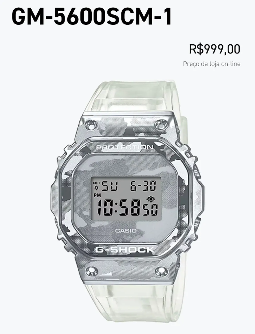 Relógio Casio G-Shock GM-5600SCM-1DR, um ícone de estilo e resistência! Com design camuflado e pulseira transparente, este relógio une moda e funcionalidade. Perfeito para quem busca um acessório que se destaca em qualquer ocasião.