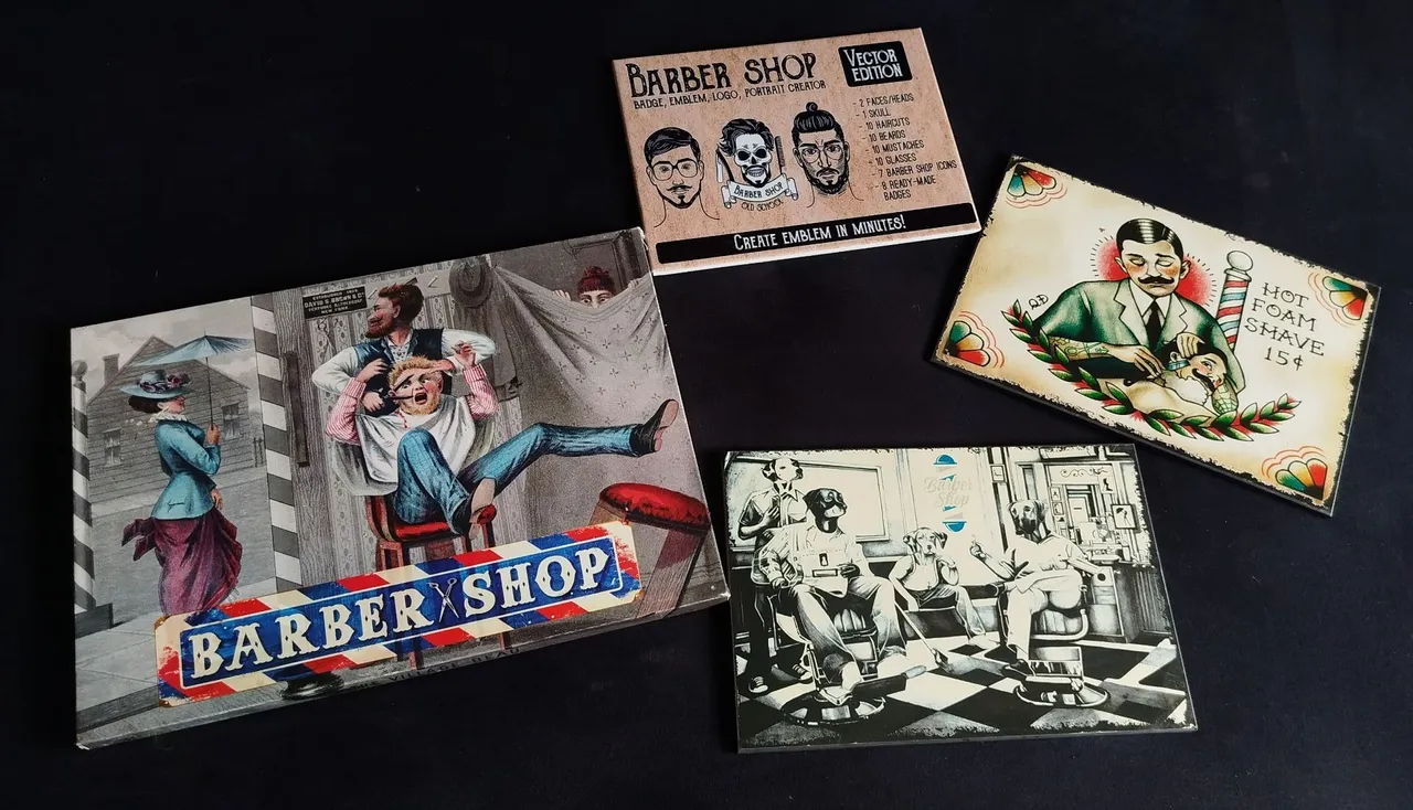 Kit com 4 quadros retrô, tema barbearia. Perfeitos para dar um toque vintage e charmoso à sua decoração. R$ 80,00 todos ou 25,00 cada os menores e 35,00 o maior.