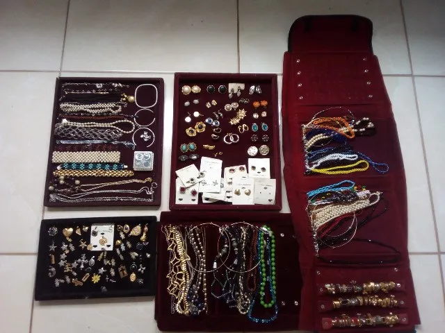 lote de bijouterias novas, ponta de estoque. paradas desde 2009 45 par de brinco completo,11 brincos faltando as presilhas de orelha,62 colar e gargantilha de metal e plastico,70 anel varios tamanhos metal masculino e feminino,55 pingente,1 broche,8 pulseira metal e plastico,6 mostruario. tudo parado desde 2009 ; alguns itens de metal tem um pouco de oxidaçao . R$ 500,00 tudo .(nao inclui despesas postais). cel (48)... ver número ( whatsapp) ,ou pelo chat .