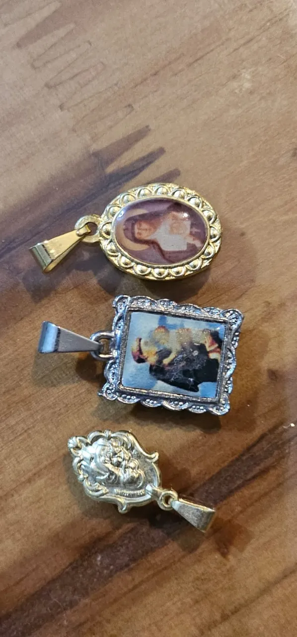 Conjunto de 3 pingentes antigos, com detalhes em ouro e imagens religiosas. Perfeitos para colecionadores ou para dar um toque vintage ao seu look.