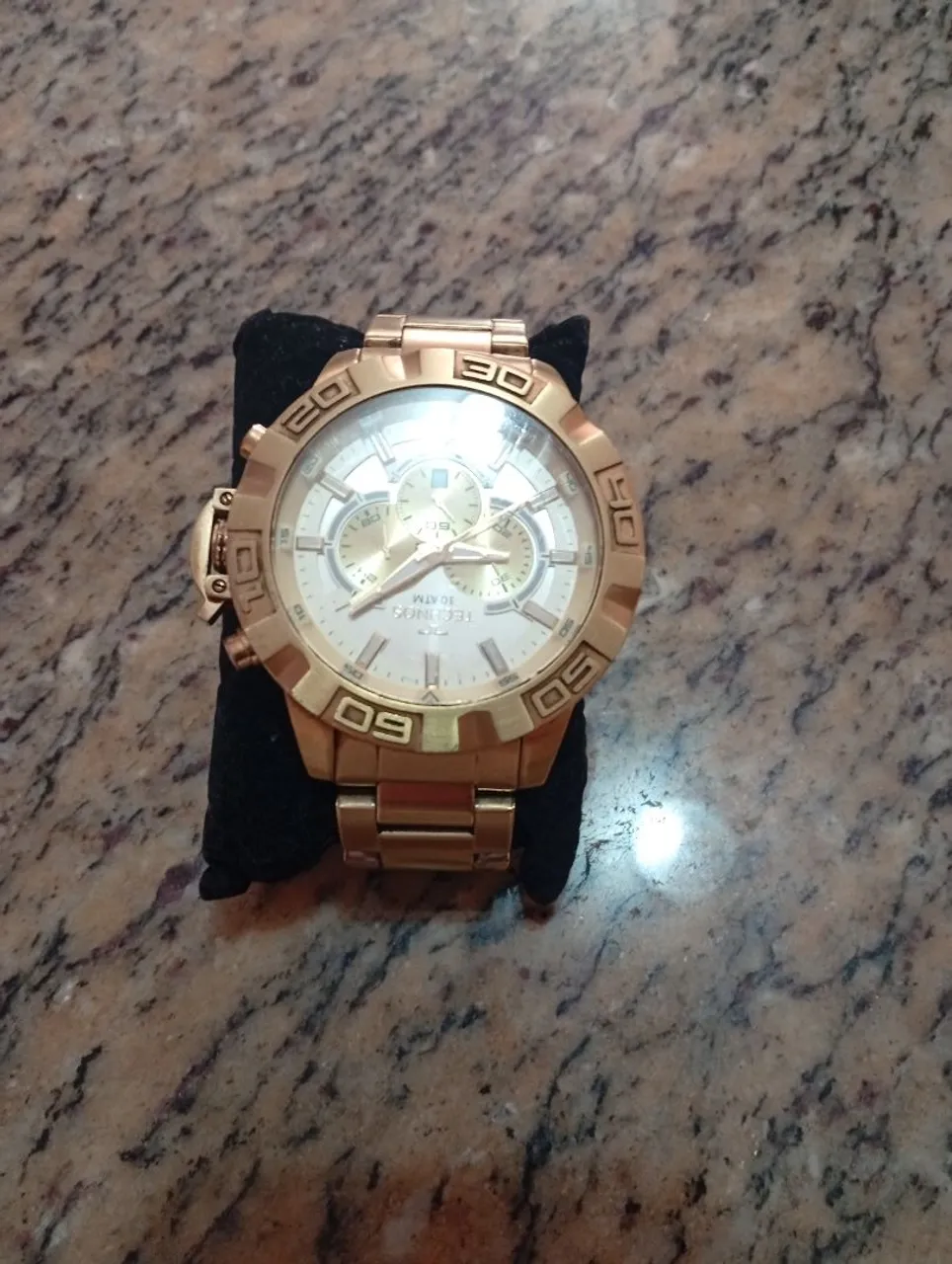 Relógio Technos dourado com design moderno e elegante. Possui cronógrafo e pulseira em aço inoxidável.