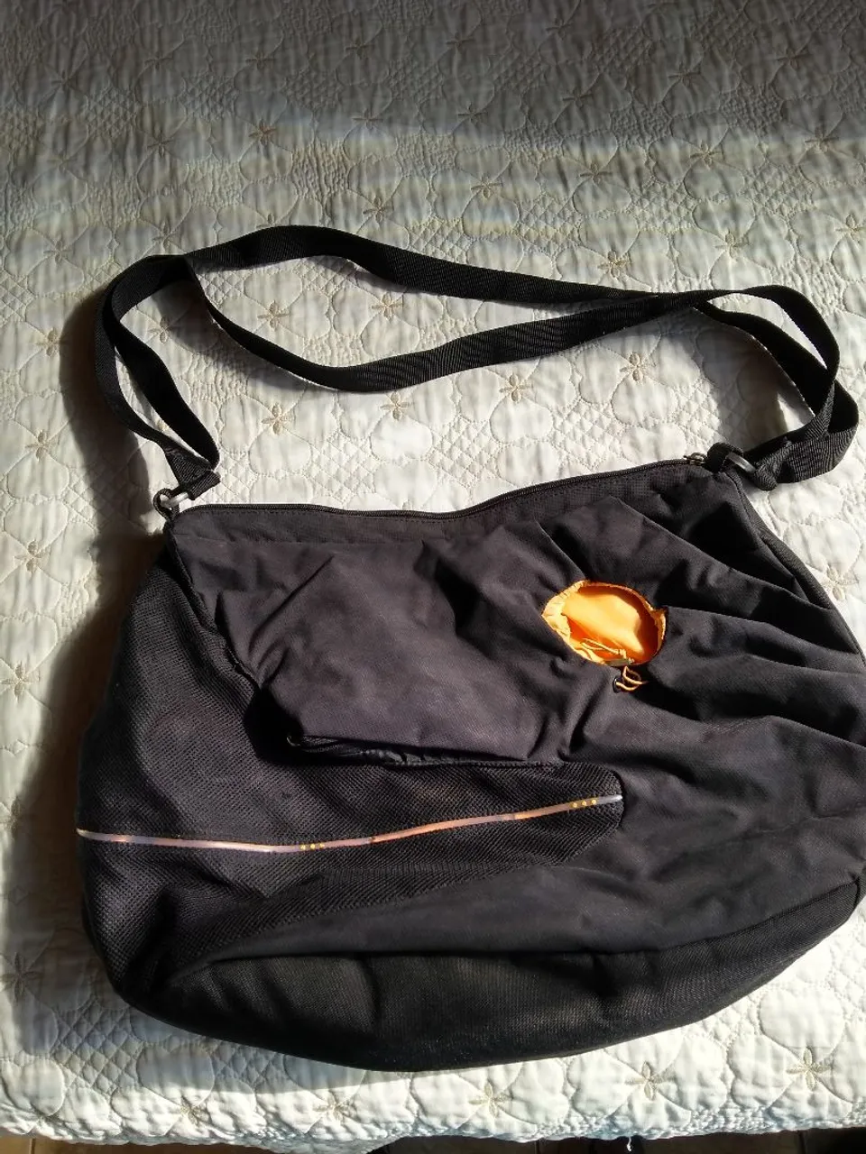 Bolsa de ombro preta espaçosa e versátil, ideal para o dia a dia. Possui design moderno, com detalhes em laranja e alça ajustável para maior conforto. Perfeita para quem busca praticidade e estilo.