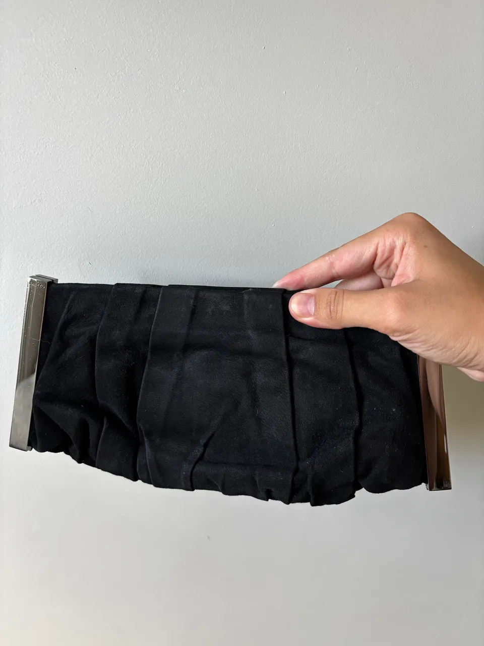 esta é uma bolsa clutch preta de camurça com fecho de metal prateado. arezzo original abertura em ima sem defeitos