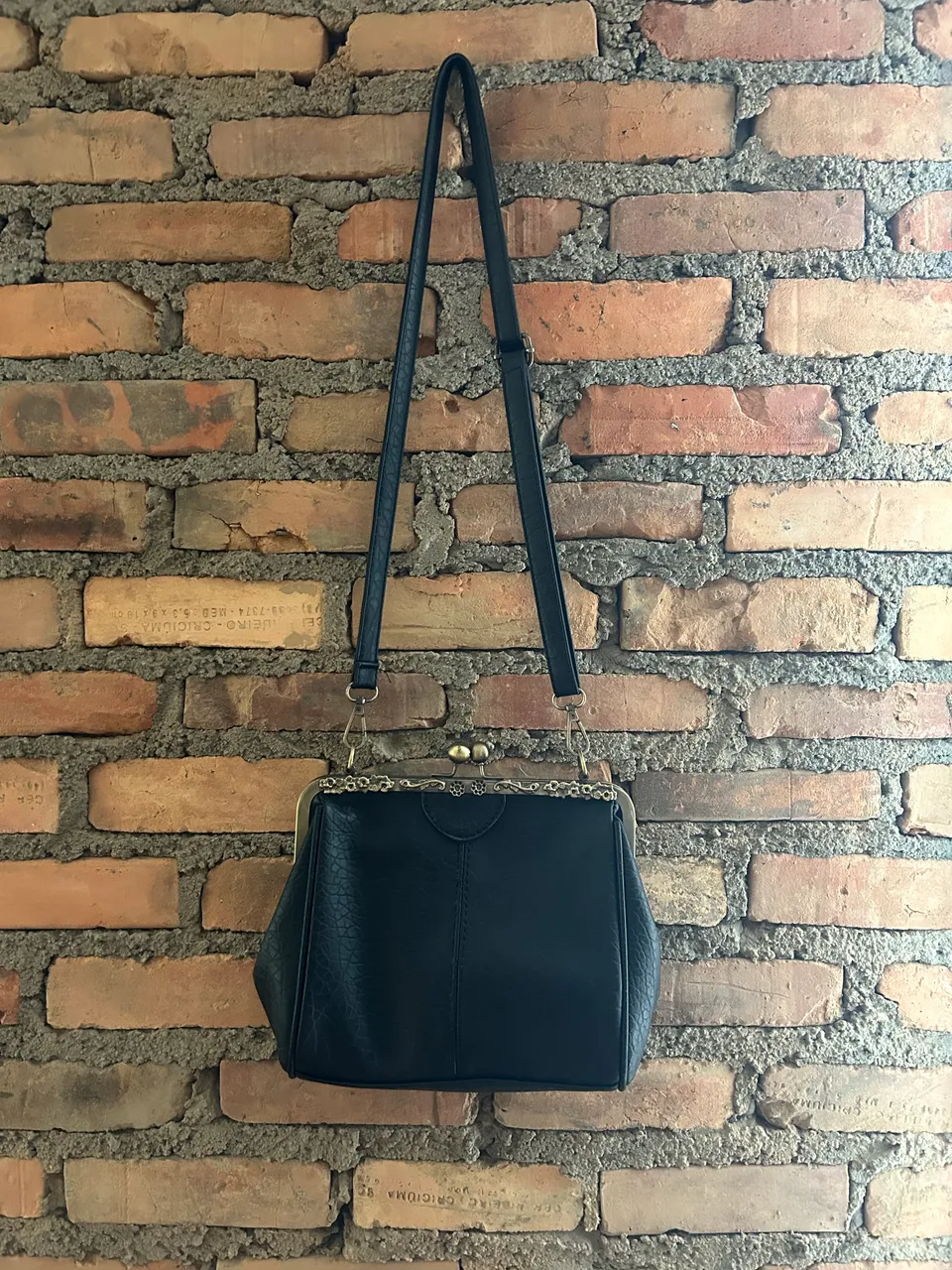 Bolsa com alça longa e uma extra curta em corino. A bolsa tem um toque retrô com a abertura estilo carteira de vovó é muito charmosa. Sem avarias.