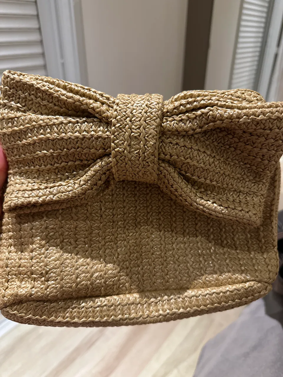 Linda bolsa de mão de palha, perfeita para um visual charmoso e natural. Seu design com laço a torna um acessório único e estiloso. Ideal para diversas ocasiões, desde um passeio casual até um evento especial.