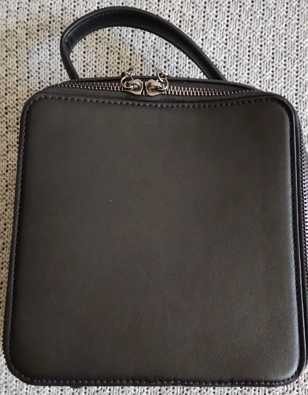Bolsa de mão preta com design moderno, ideal para diversas ocasiões. Possui alça resistente e fechamento seguro com zíper, perfeita para carregar seus pertences com estilo e praticidade.