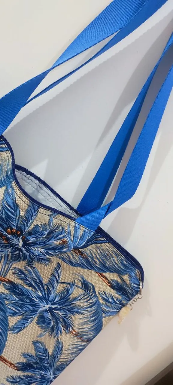 Feita à mão com tecido resistente e acabamento impecável, essa bolsa é puro charme e qualidade! O design tropical com palmeiras em azul dá aquele toque sofisticado e moderno pra qualquer look - perfeita pra praia, passeio ou dia a dia.