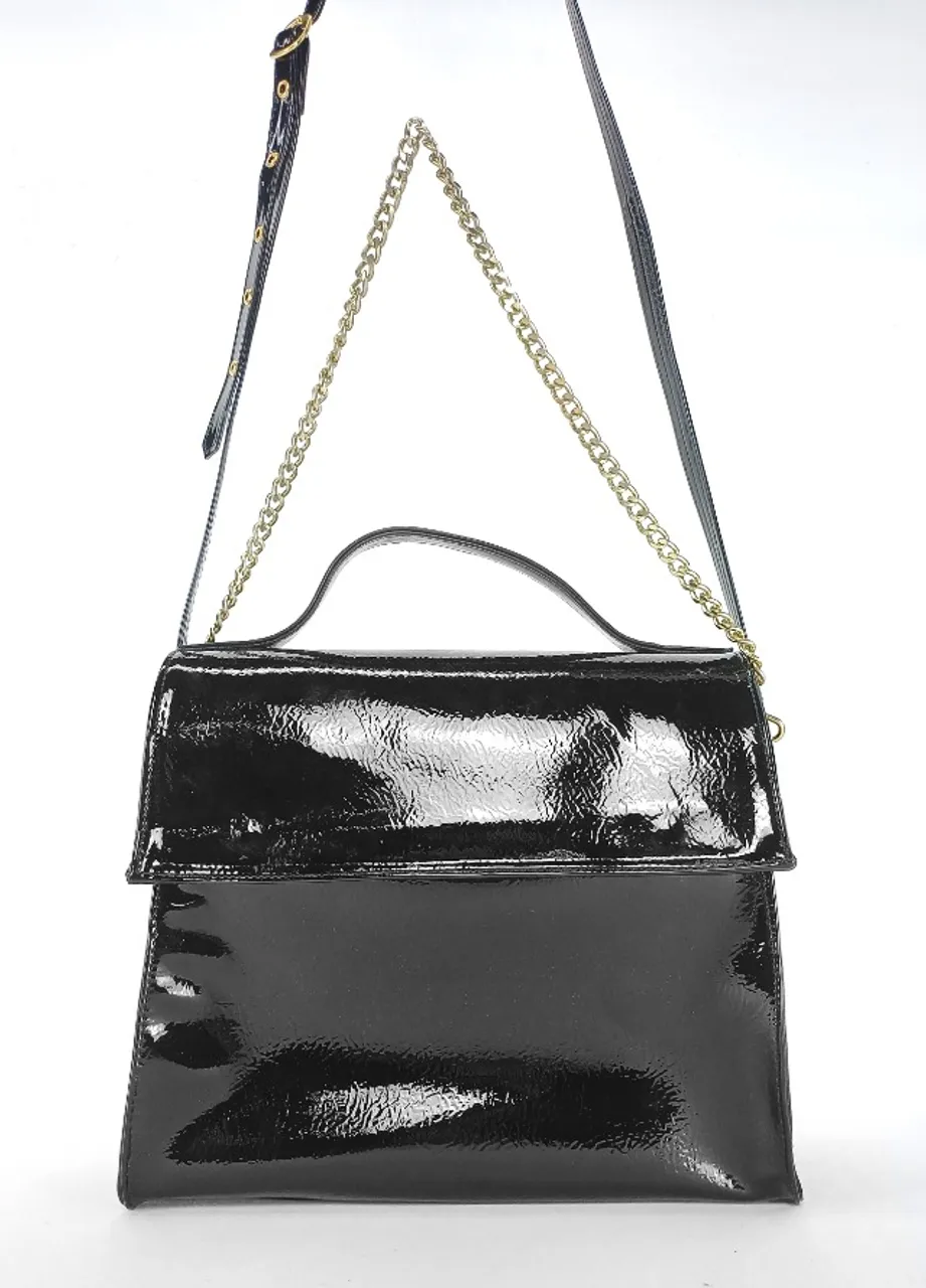Sintético em vinil (verniz) preto de alto brilho, com textura lisa e reflexiva.