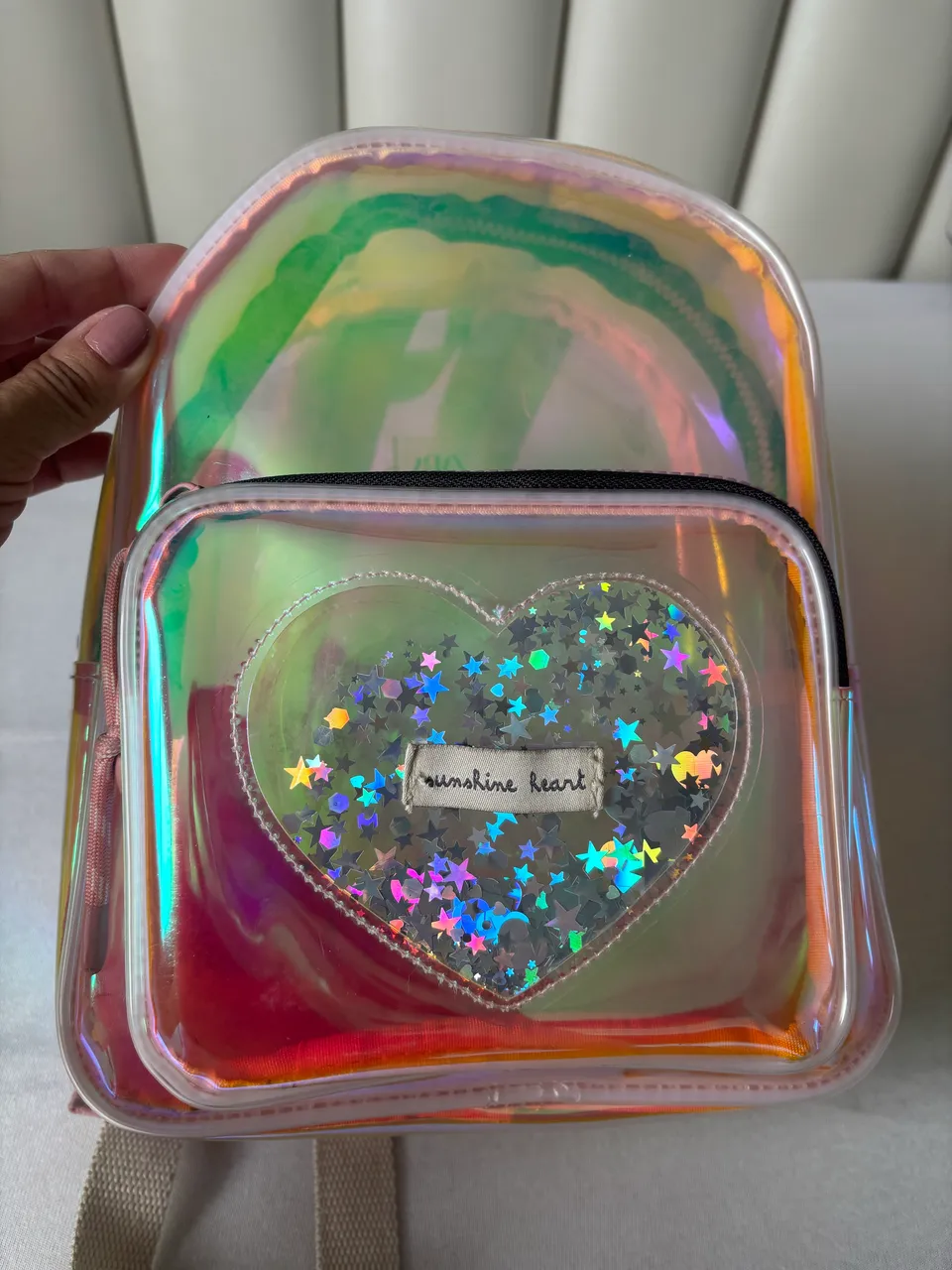 Mochila infantil Zara transparente (furta-cor) com zíper e bolsinho frontal. Aproximadamente 26 cm de altura. Super conservada!