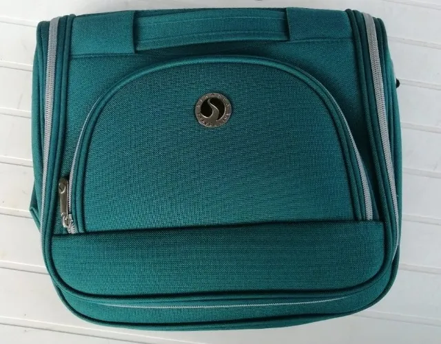 Frasqueira Stradda na cor verde. Possui gancho para pendurar aberta o que facilita muito o uso em banheiros, 4 apoios inferiores em borracha para colocar sobre superfícies, bolsos internos telados e com elástico para melhor acomodação dos produtos em seu interior. Espelho fixado em velcro destacável, alça removível para carregar no ombro tipo bolsa a tiracolo ou então use a tira localizada na parte posterior para levar encaixado no carrinho da mala.