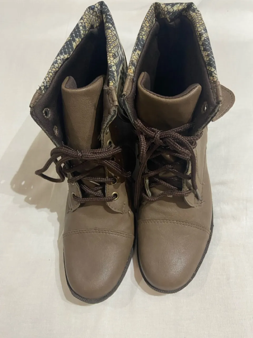 Bota estilo coturno na cor marrom, perfeita para o dia a dia, moderna e estilosa. Detalhes em animal print que valorizam o look. Semi-novo, sem avarias. Tamanho 34.