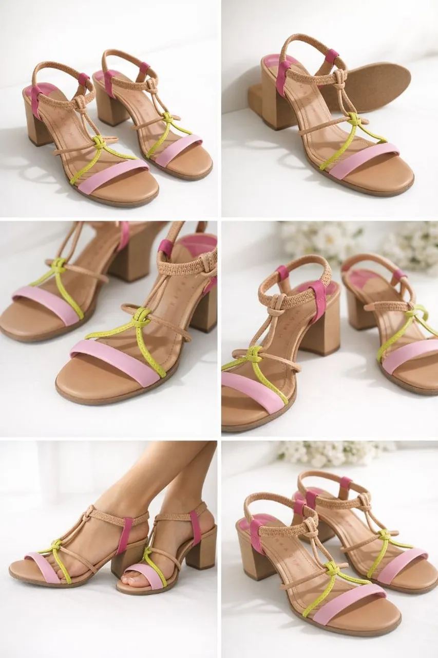 Sandália de salto baixo com design moderno e cores vibrantes que combinam estilo e conforto. Perfeita para diversas ocasiões, do dia a dia a eventos especiais.