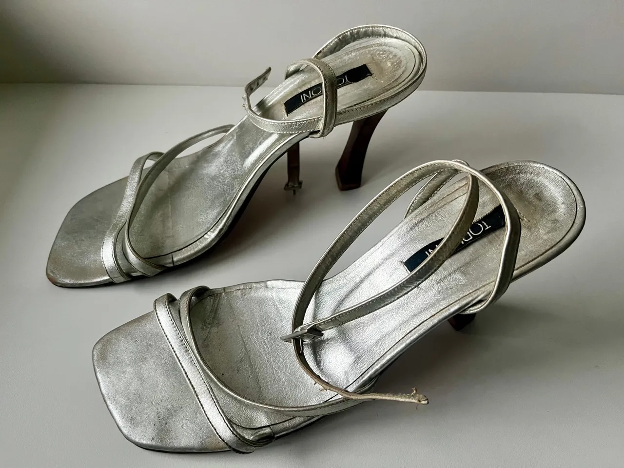 Sandália de couro prata e salto de madeira, marca Torloni, tamanho 38, salto 10cm