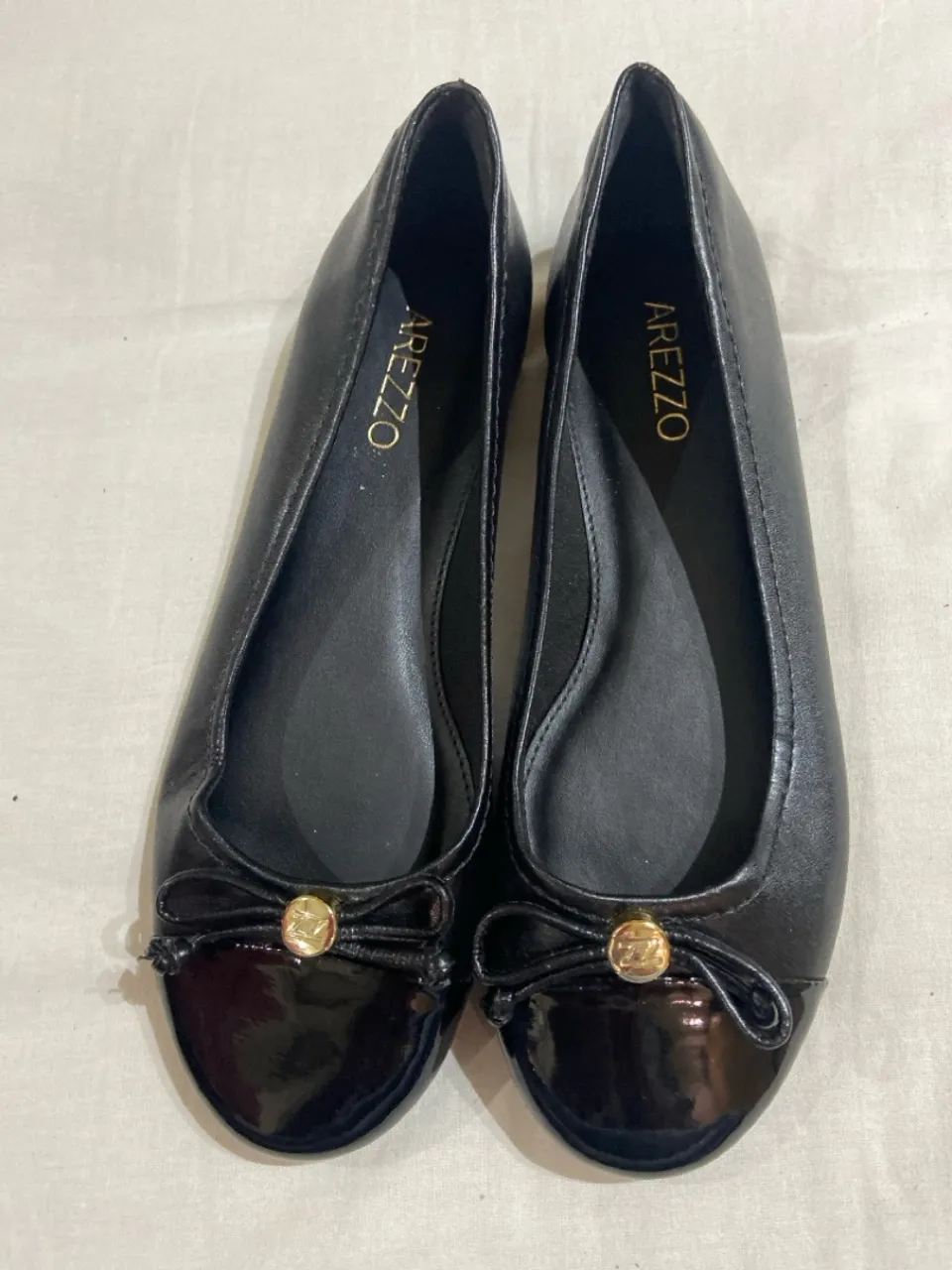 Charmosa sapatilha Arezzo preta, perfeita para um visual elegante e confortável. Detalhes de laço e metal da marca. adicionam um toque de glamour ao seu estilo. Tamanho 35. Nova