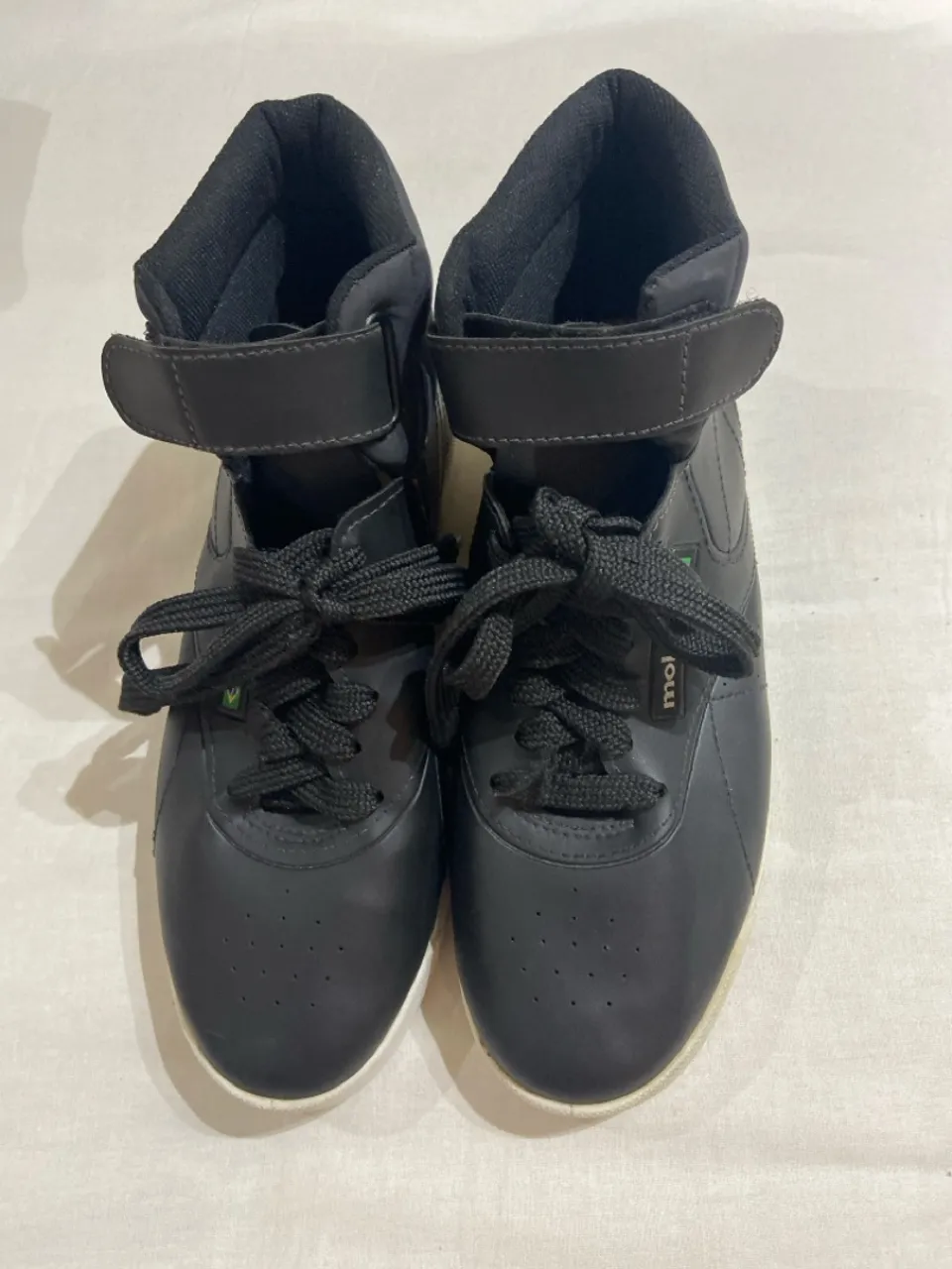 tênis preto, cano alto, bem estiloso e confortável. Marca Moleca, tamanho 35. Fechamento por cadarço e velcro. Pouco usado, sem avarias.