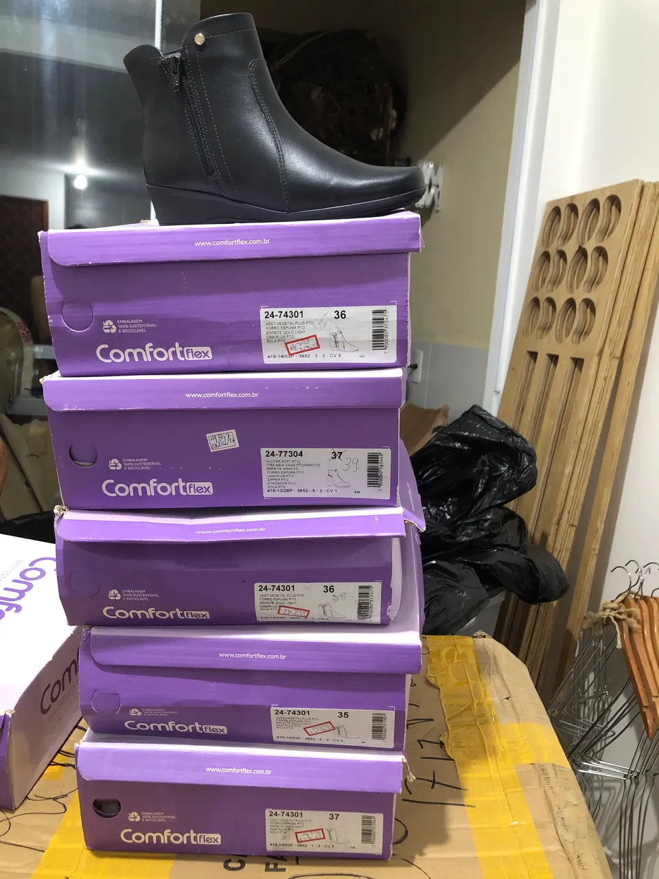Lote de botas Comfortflex em caixa fechada, perfeito para revenda ou uso pessoal. Conforto e estilo garantidos!