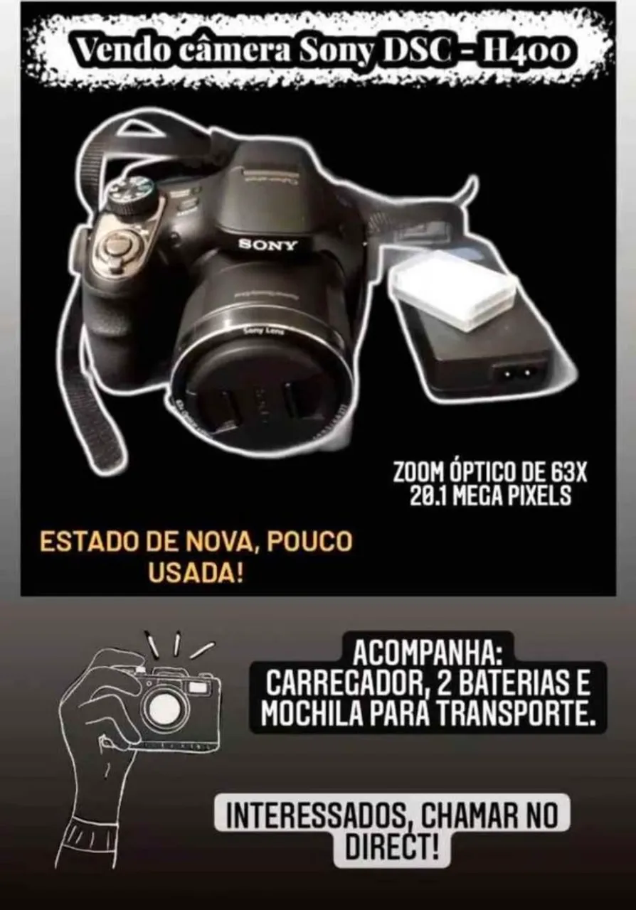 Zoom óptico de 63x e 20.1 megapixels. Acompanha carregador, 2 baterias e mochila para transporte.