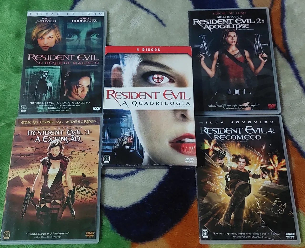 Coleção completa de filmes Resident Evil, incluindo a quadrilogia em DVD e mais dois filmes da franquia. Para fãs de ação e zumbis!