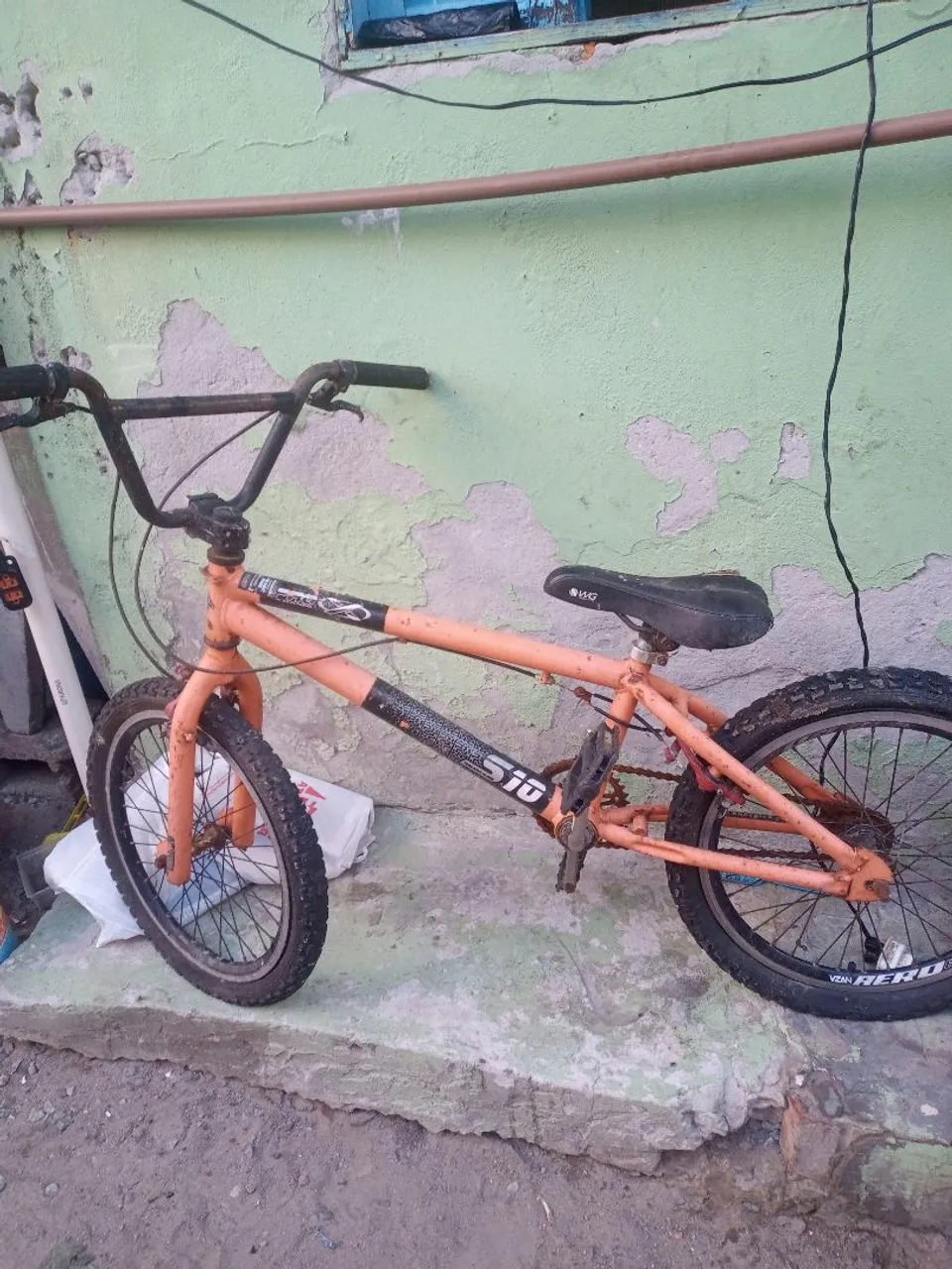 Bicicleta BMX laranja, perfeita para manobras e muita diversão! Design moderno e resistente, ideal para quem busca adrenalina sobre duas rodas. Pura emoção em cada pedalada! Só tem uns defeitos pra arrumar