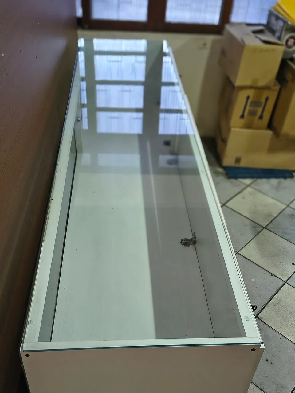 Balcão vitrine branco, ideal para expor seus produtos com elegância e visibilidade. Design moderno e funcional, perfeito para diversos tipos de comércio.
