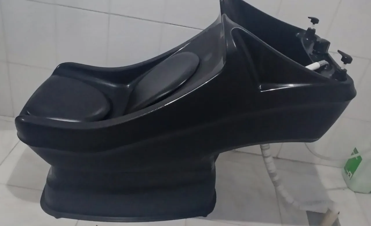Conjunto de equipamentos para salão de beleza composto por cadeira de manicure com gaveta, apoio para os pés, suporte removível para alicates e acessórios e lixeira removível. Inclui carrinho para esmaltes, carrinho de apoio com gavetas e tomada integrada, estelirizador de alicates e lavatório com compartimentos embutidos para shampoo e condicionador