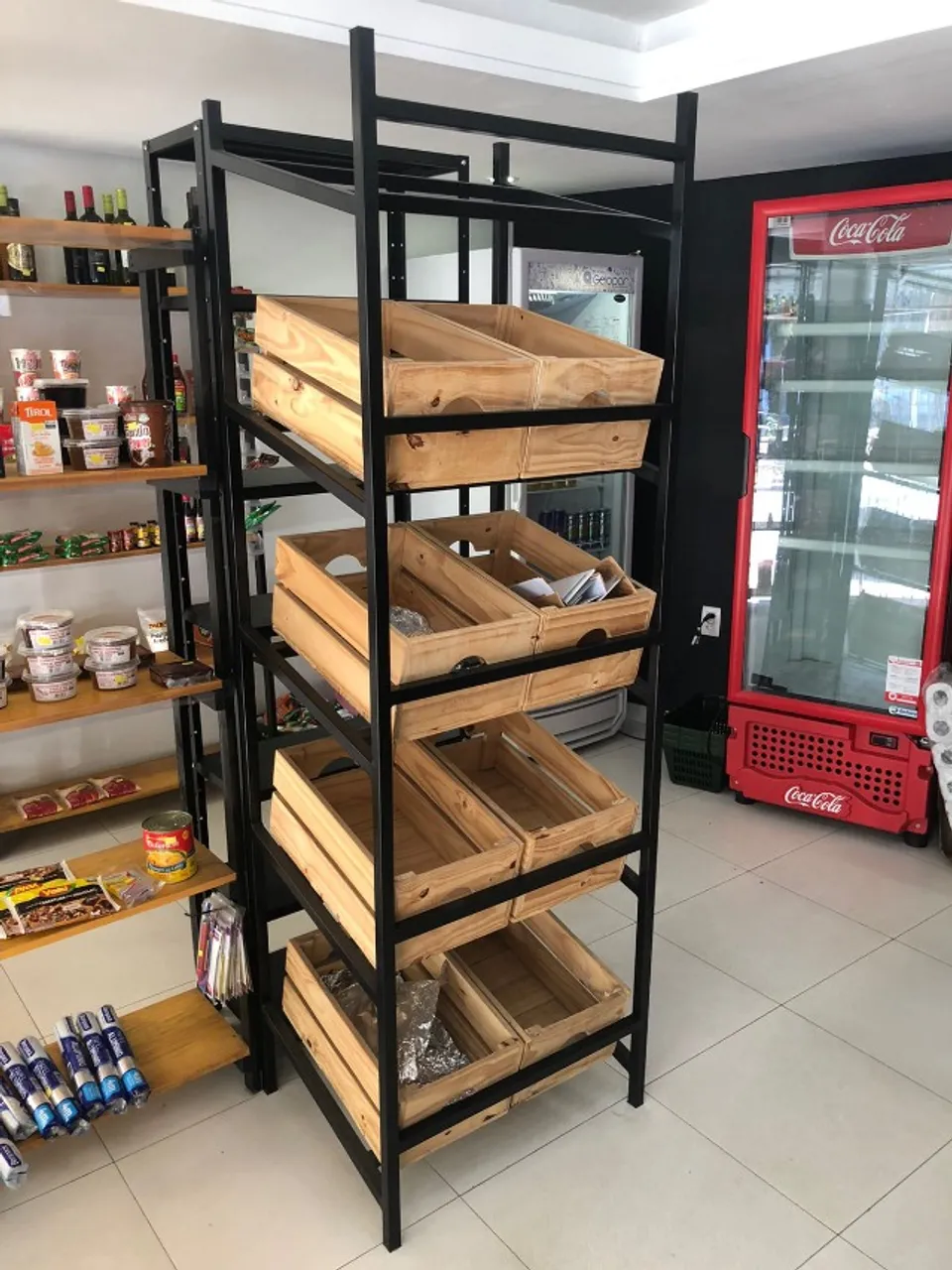 Expositor de ferro com caixas de madeira, a combinação perfeita para organizar e expor seus produtos com estilo e praticidade. Ideal para diversos tipos de comércio, esse expositor valoriza seus itens, atraindo a atenção dos clientes e otimizando o espaço.