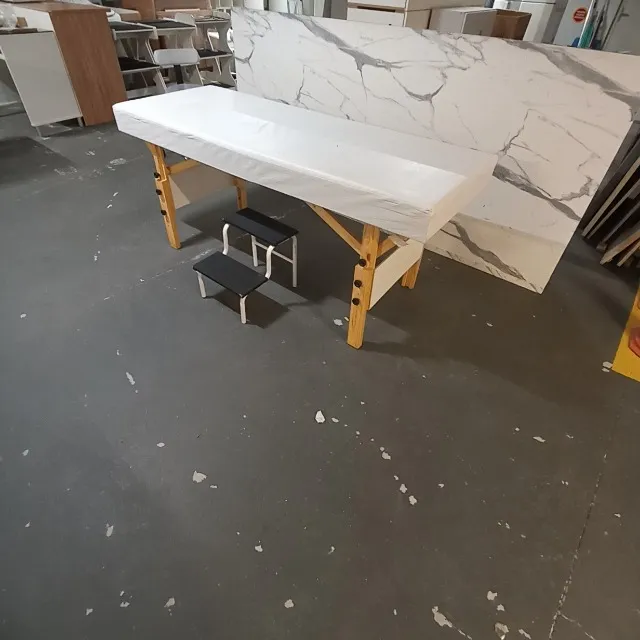 Mesa de massagem com design elegante e funcional, ideal para profissionais da área. Inclui escada para facilitar o acesso e oferecer conforto ao cliente.