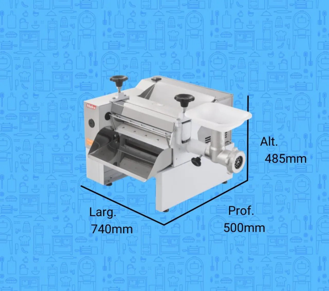 Máquina Hidra profissional para moer e misturar massas, ideal para restaurantes e comércios. Dimensões: 740mm (largura), 500mm (profundidade) e 485mm (altura). Equipamento eficiente e de alta performance.